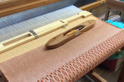 こんにちは~、今日は織物教室だったchiguです。 で、帰って来てからも織機があるなんて本当に嬉しい。 オーバーショットのマフラー。進んでるよ。 二丁のシャトルを交互に使うことややや複雑なペダルの踏み …